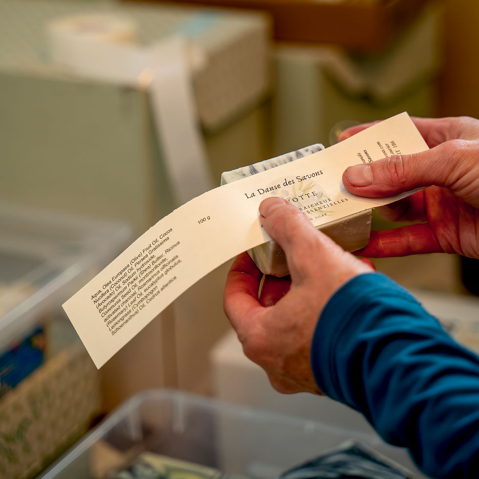 Once cured, each soap is wrapped with care. I design my own labels keeping them refined, minimal and eco‑conscious.